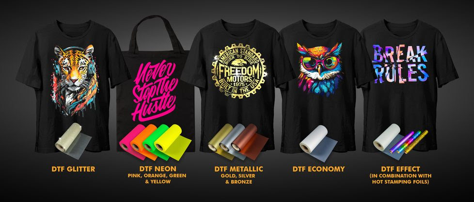 - DTF Glitter : Des paillettes intégrées directement dans le film pour des transferts scintillants, parfaits pour la mode, les accessoires et les articles cadeaux. Un effet "wow" garanti sans post-traitement.